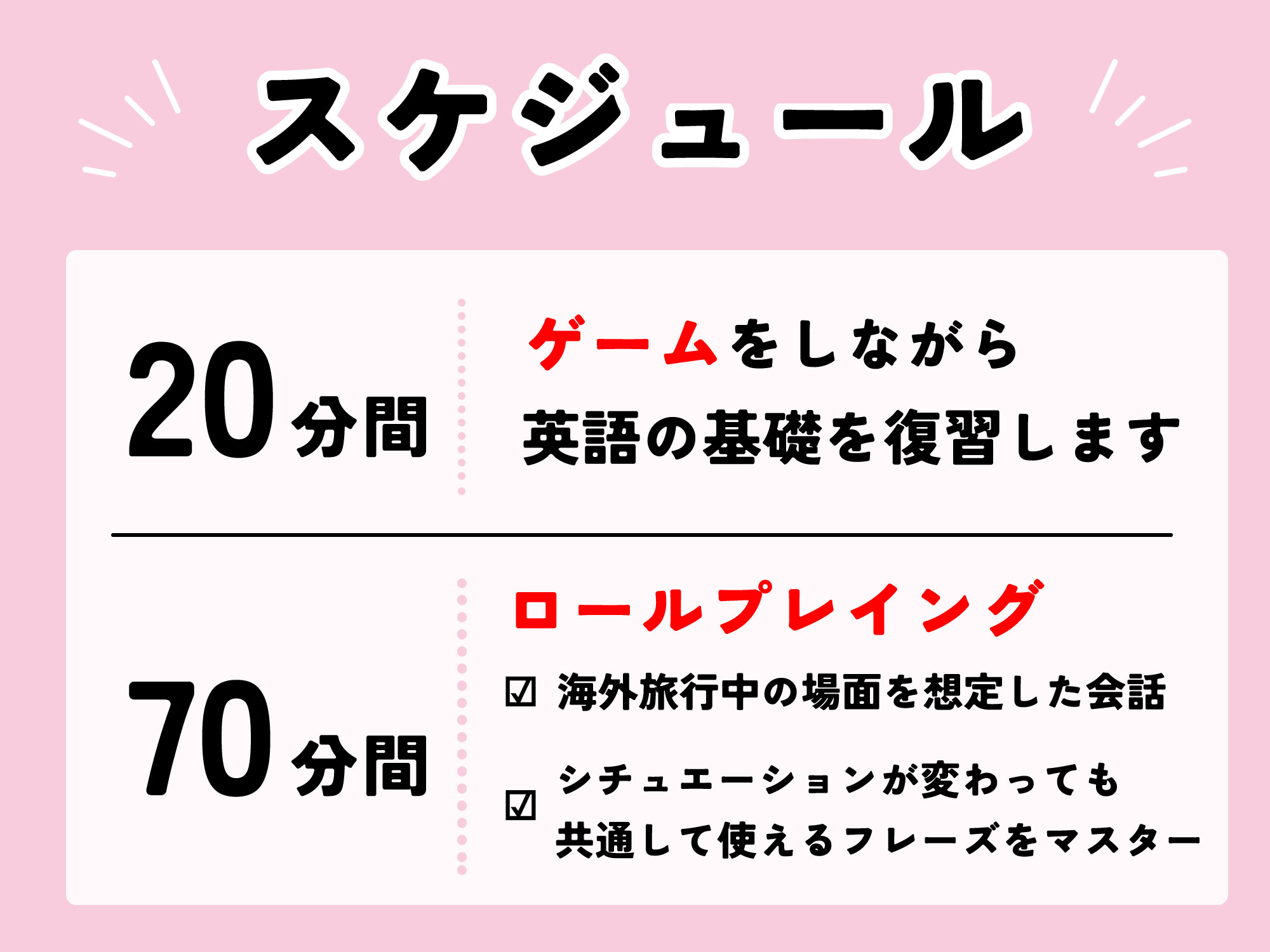 海外旅行先でしたいことは、あれこれあるけれど。。。 英語が苦手で話せない。。。でも話したい。 そんな方におすすめの90分間の体験講座です。 オールイングリッシュが基本ですが、すぐに日本語訳も交えます。 最初の20分間は、ゲームをしながら英語の基礎を復習します。 次に、海外旅行中の場面(レストラン・ショップ・駅・交通)を想定してロールプレイング。 シチュエーションが変わっても、共通して使うことができる簡単なフレーズをマスターします。 間違いを恐れずに、レッツ スピーキング! お友達や、親子での参加もお待ちしております。 【お申込み】 ■SNSまたは、お電話(090-8391-8478)にてお申込みください。 お申込みの際に下記をお伝えください。 ①お名前 ②ご連絡先 ③参加人数 ▽寺子屋ここから公式ホームページ https://terakoko.com/