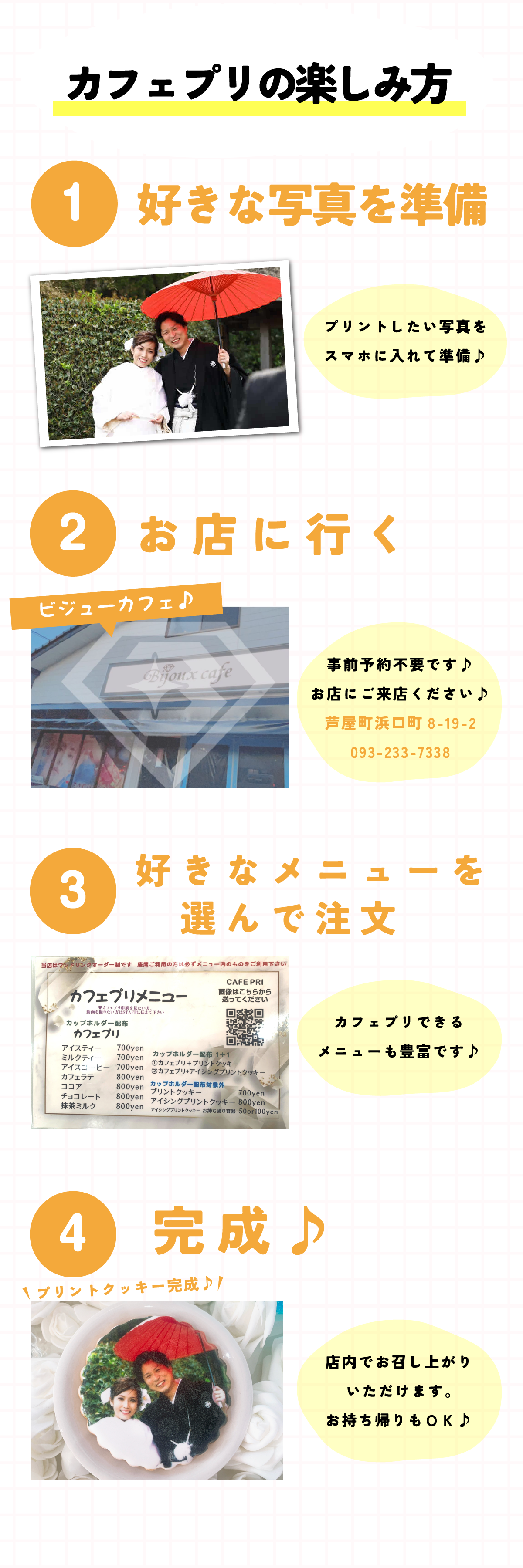 芦屋町のビジューカフェにて、カフェプリ体験ができます♪ 事前予約不要♪営業時間中(イベント時を除く)にお好きな写真をご持参ください♪ プリントクッキーやアイシングクッキーにお好きな写真をプリントいたします♪ ■料金 ・700円(プリントクッキー) ・800円(アイシングプリントクッキー) ■ビジューカフェのSNSもフォローよろしくお願いします♪ [LINE]https://liff.line.me/1645278921-kWRPP32q/?accountId=bijouxcafe [ツイッター]https://twitter.com/Bijoux_cafe [インスタ]https://www.instagram.com/bijoux.cafe/