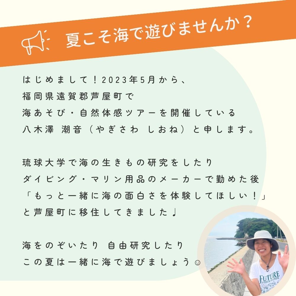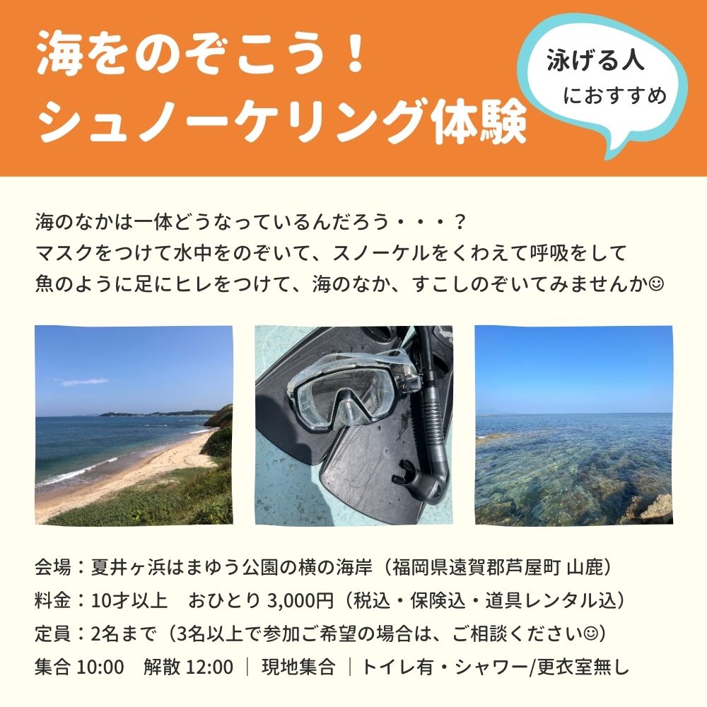 海の中にはどんな世界が広がっているんだろう?マスクをつけて水中をのぞいて、スノーケルをくわえて呼吸をして、魚のように足にヒレをつけて、海の中をのぞいてみませんか(^^) シュノーケリングはいつかやってみたいと思っていた、久しぶりに海で泳ぎたい、道具は買ったけど使い方がわからないから教えて!そんな方のご参加お待ちしております。 【集合・解散時間】 10:00集合 12:00解散 【プログラムの流れ】 10:00 集合(着替えやお手洗いなどおすませください) 10:10 海岸に移動・準備運動・道具のサイズ合わせ 10:15〜10:30 マスクとスノーケルの使い方レクチャー 水中をのぞいてみよう 10:30~10:45 フィンの使い方レクチャー 水面をスイスイ進んでみよう 10:45〜11:00 いざ!海探検 シュノーケリング♩ 11:00〜11:15 休憩 11:15〜11:50 たっぷりシュノーケリング 11:50〜12:00 ふり返り・解散 【開催日・予約状況】 7月15日(土)〜22日(土) 8月1日(火)〜6日(日)、17日(木)〜24日(木) 最新の予約状況はこちらをご確認ください。 https://ameblo.jp/umi-ashiya/entry-12808715533.html ※ライフジャケット、シュノーケリング道具はこちらでご用意いたします。 ※お手持ちのシュノーケリング器材がありましたら、持参OKです。道具を使いこなして、水中を楽しみましょう♩ ※トイレはありますが、シャワー・更衣室はありません。 ※小雨決行。暴風雨・台風・警報発令時は中止。 ※キャンセル料はかかりません。体調がすぐれない場合はご遠慮なくお申し出ください。 ■お申込み(プログラム名・ご希望の日・時間をお伝えください。) ①LINEでお申込み ・友達登録後メッセージをお願いいたします。 ・https://lin.ee/RGlDVdq ②電話でお申込み ・070-5274-6262 SNSもやっていますので、良かったらフォローください。 ▽芦屋町|海あそび・自然体感ツアー https://www.instagram.com/umi.ashiya/