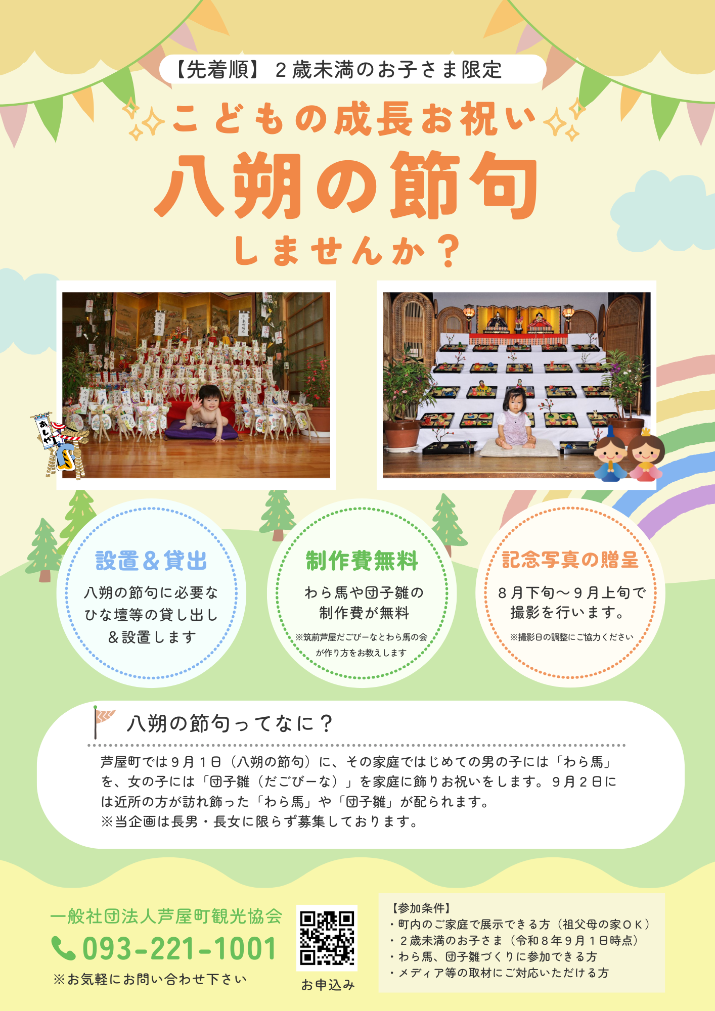 芦屋町の伝統行事「八朔の節句」をする家庭を募集いたします。 先着順となっておりますので、お申込みのタイミングによっては、お申込みが完了している場合もございます。ご了承ください。 ■お申込みについて ・以下よりお申し込みをお願いいたします。 https://forms.gle/jAnH3pKHDH3quC3k6 ■参加条件 ・芦屋町内のご家庭で展示できる方(祖父母の家OK) ・2歳未満のお子さま(令和7年9月1日時点) ・わら馬、団子雛づくりに参加できる方 ・メディア等の取材にご対応いただける方 ■八朔の節句とは? 芦屋町では9月1日(八朔の節句)に、その家庭ではじめての男の子には「わら馬」を、女の子には「団子雛(だごびーな)」を家庭に飾りお祝いをします。9月2日には近所の方が訪れ飾った「わら馬」や「団子雛」が配られます。 ※当企画は長男・長女に限らず募集しております。 ■お問い合わせ 芦屋町観光協会 093-221-1001